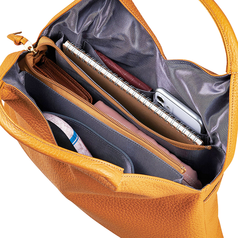 | ●機能 | ファスナー開閉式、内アオリポケット×2(うち1つにオープンポケット×2、うち1つにファスナーポケット×1)、前面オープンポケット×2、持ち手立上り約14.5cm、小判底仕様(55~100mm)、真中の高さ約20cm |