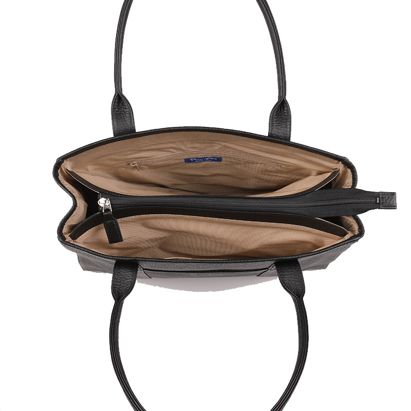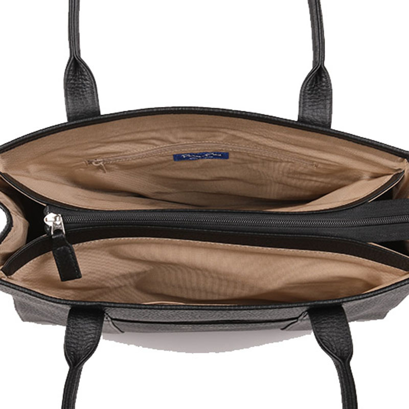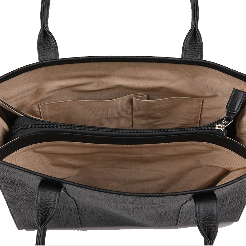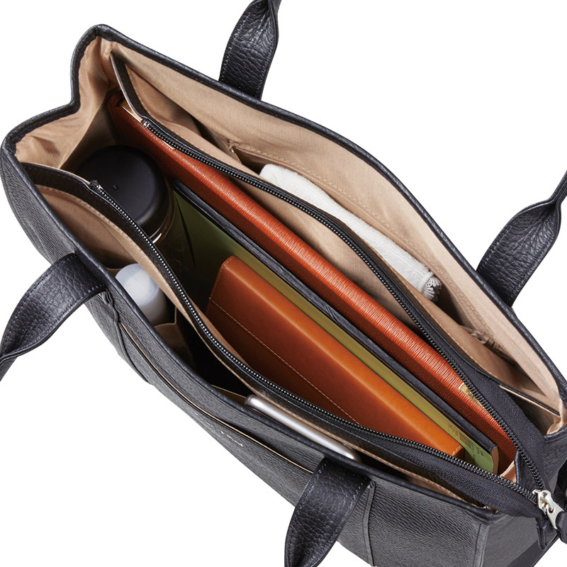 | ●機能 | ファスナー開閉式。内:アオリポケット×2(うち1つにファスナーポケット×1・内1つにオープンポケット×2)、外:オープンポケット×1。持ち手立上り約23cm。底鋲有。A4ファイルサイズ対応 |