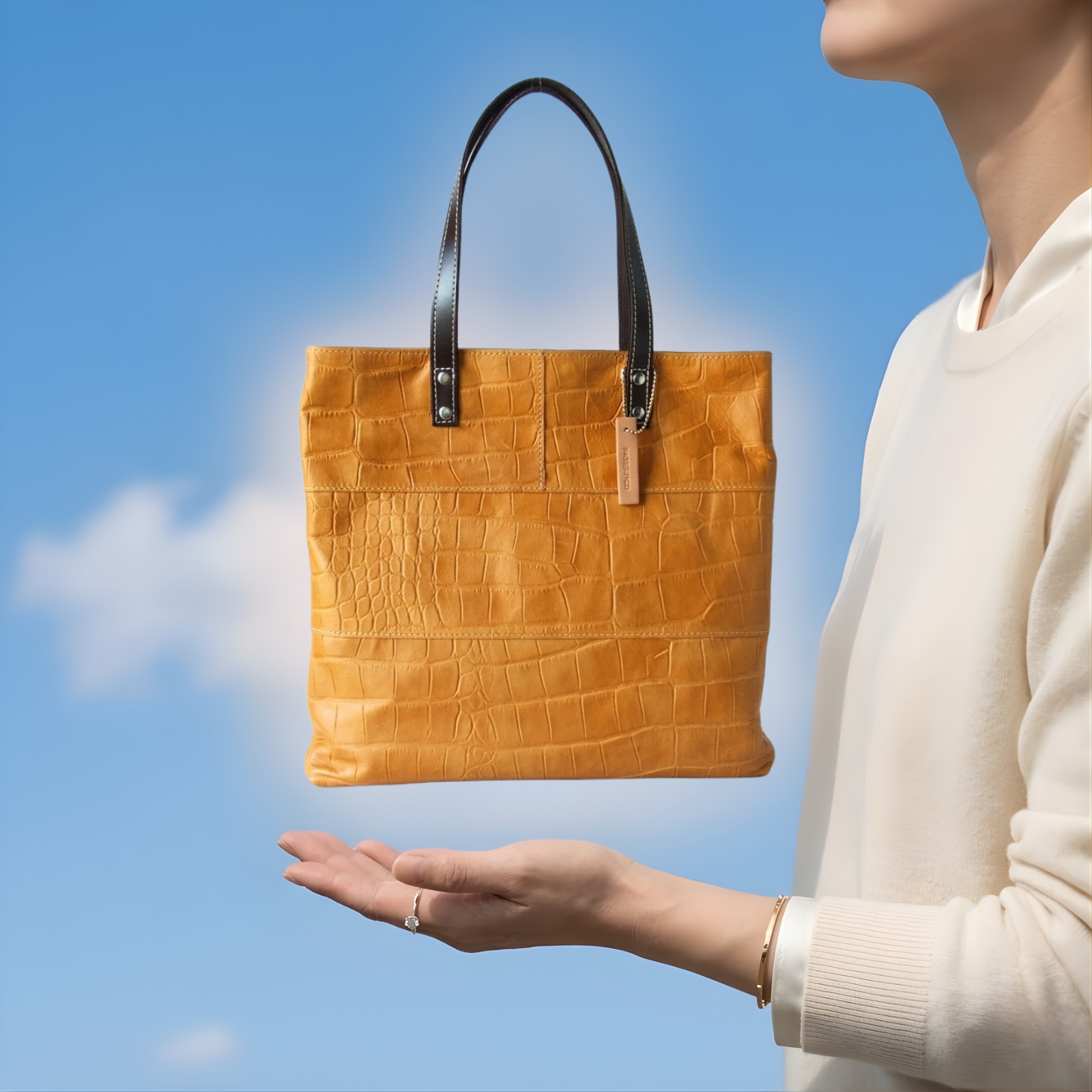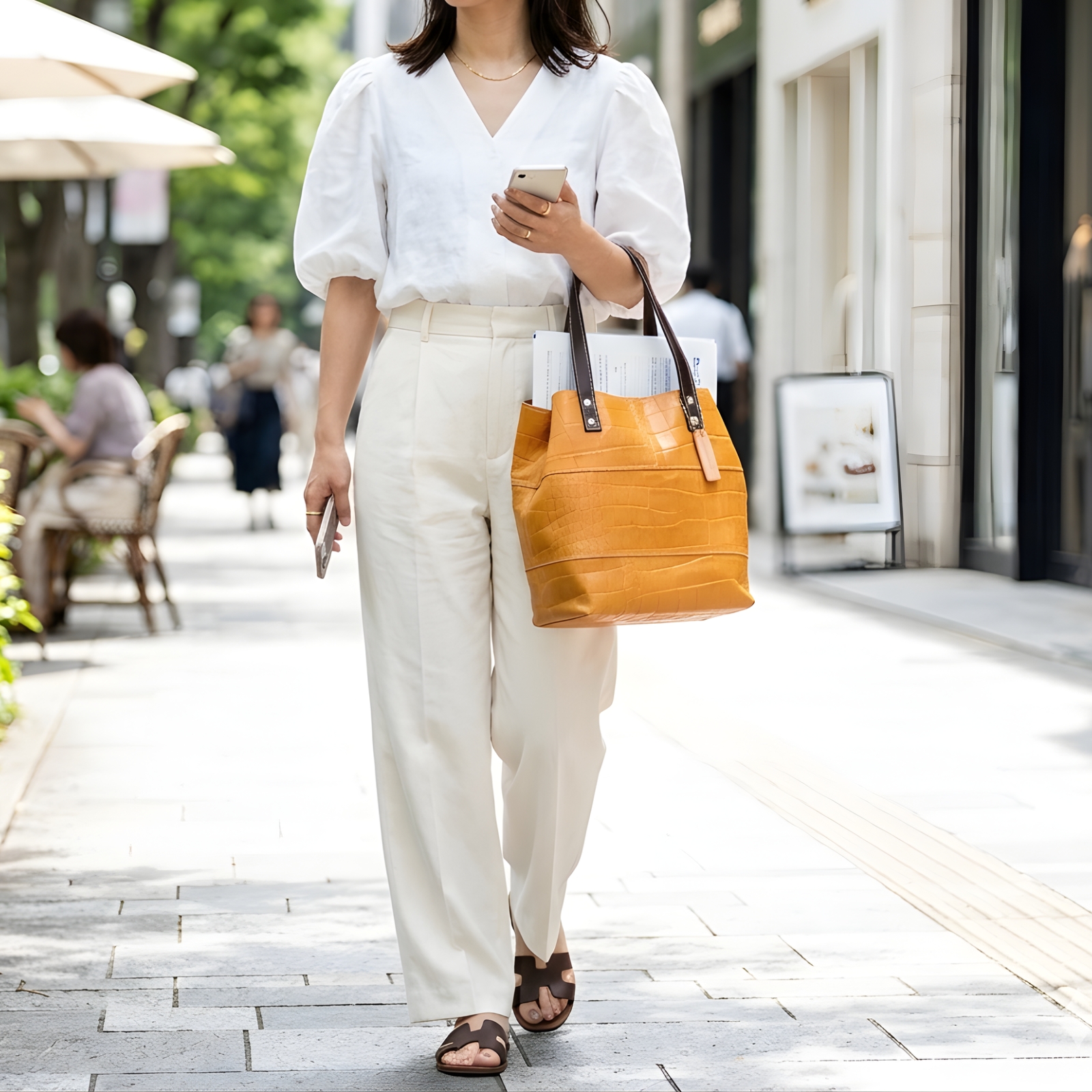 「本革バッグは重い」という常識を覆す、わずか360gの奇跡。一日中持ち歩いても、夕方の肩こりに悩まされることなく、足取り軽く颯爽と歩けます。重さから解放された、本当の自由を体感してください。