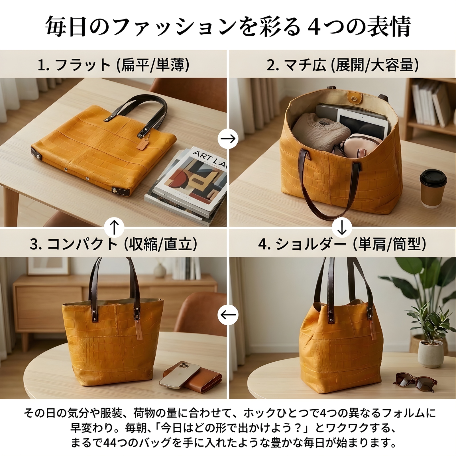 気分や荷物に合わせて4つの表情を見せる、純日本製・本革4WAYトート。