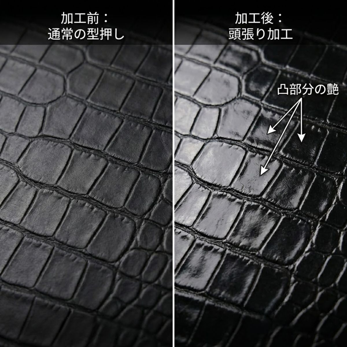 厳選された上質な牛革に、繊細なクロコダイルの型押しを施し、さらに表面を丁寧に仕上げることで、上品な光沢と深みのある表情を生み出しました。触れるたびに感じるしなやかな質感と、使うほどに増す風合いの変化をお楽しみいただけます。