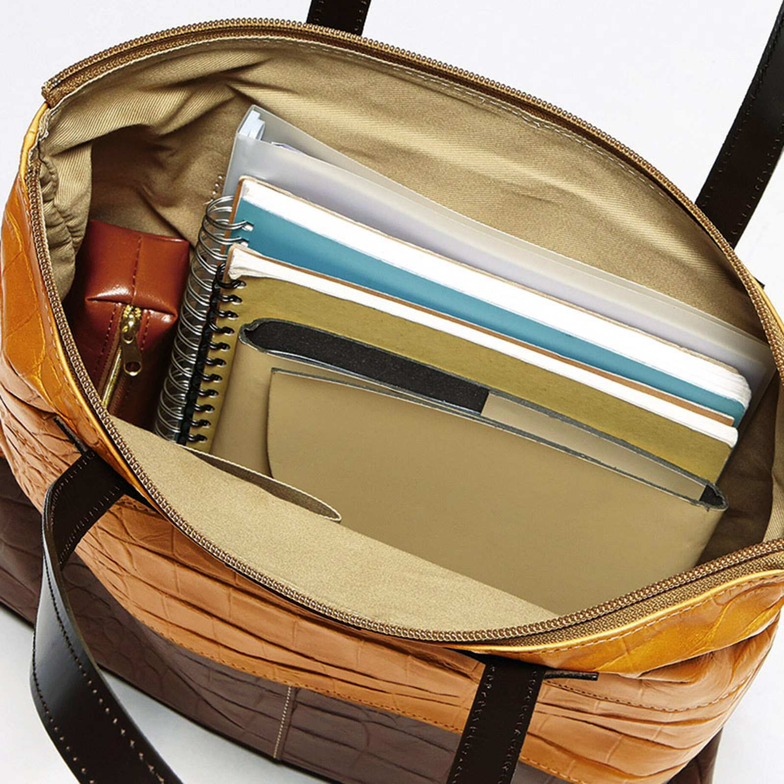 複数の内ポケットと外側のファスナーポケットで、小物をきれいに整理整頓。必要なものを探す手間が省け、スマートな所作で一日を過ごせます。