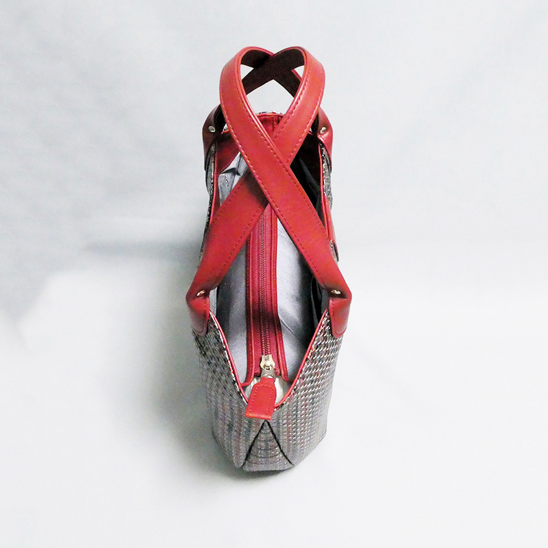 | ●機能 | ファスナー開閉式、内=アオリポケットx2(内1つにオープンポケット×2、内1つにファスナーポケット×1)、外=板ポケットx2、持ち手立上り約14cm |