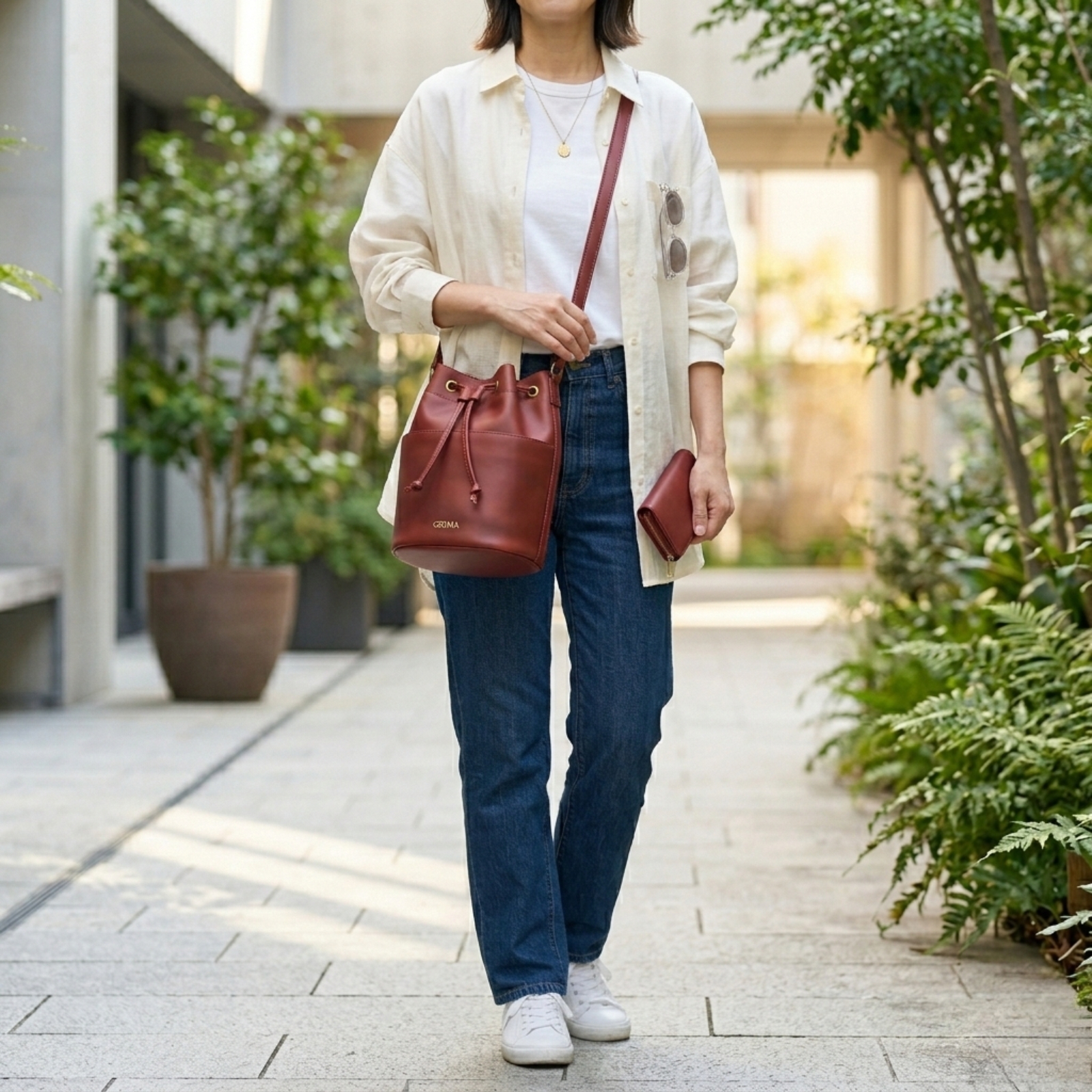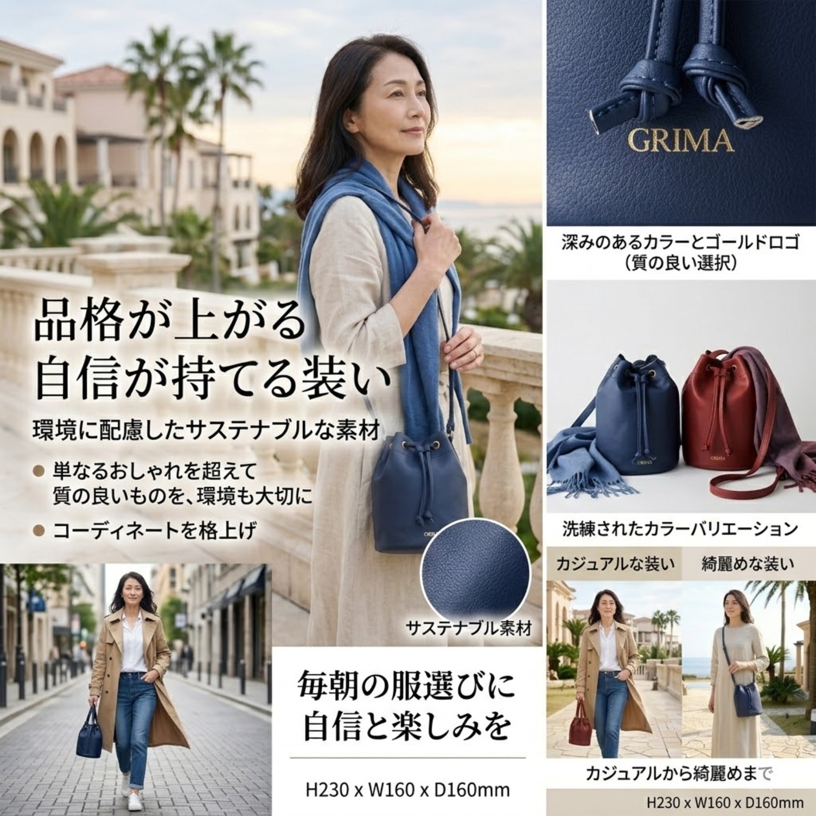 きらりと輝くゴールドのフロントの「GRIMA」ロゴが高級感をプラスし、洗練された大人の女性らしさを演出します。