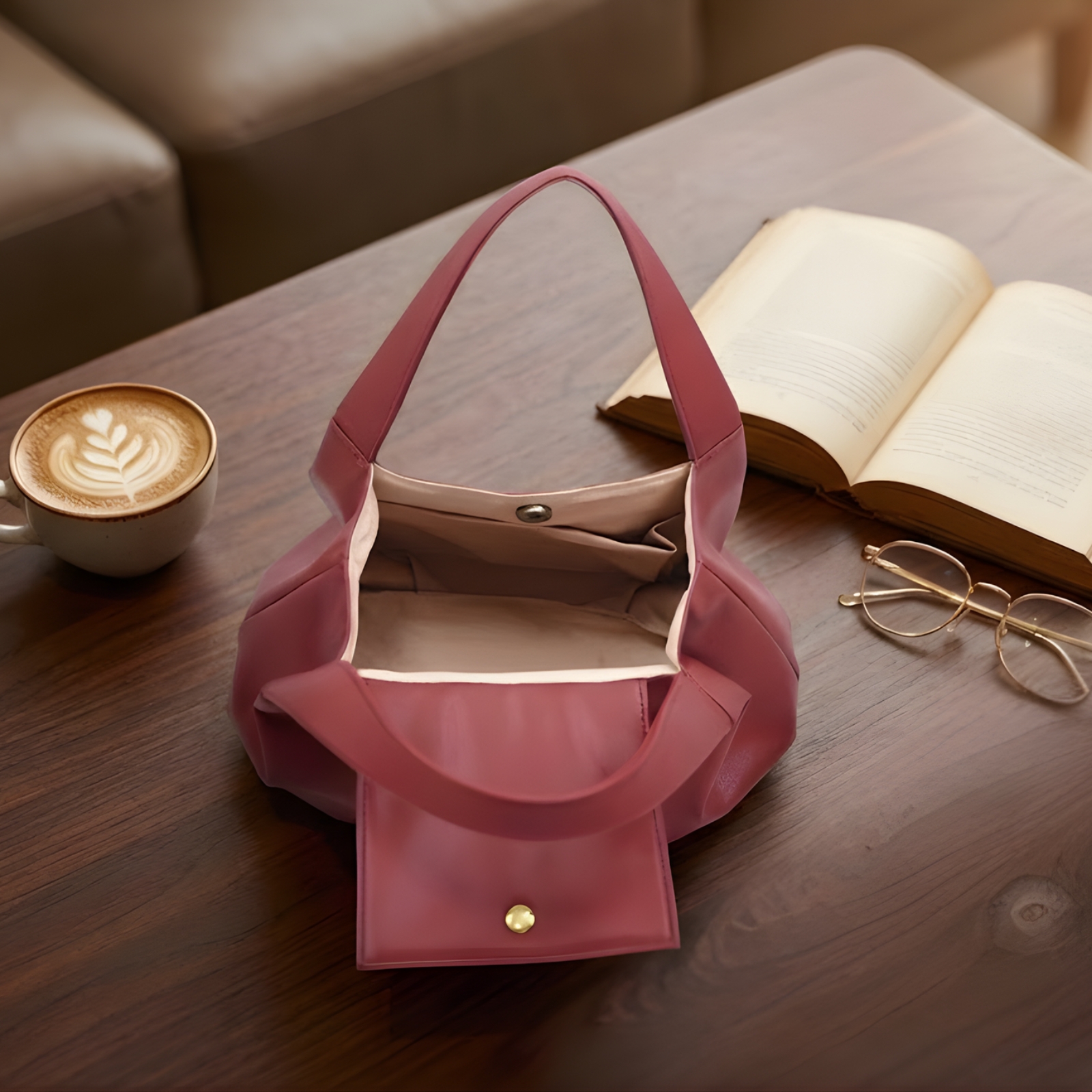 ガバッと開いて、一目瞭然。スマートな開閉で、所作まで美しく。このフラップを内側に入れ込むだけ。マグネットが自然にパチンと留まり、中身が見えにくくなるので人混みでも安心です