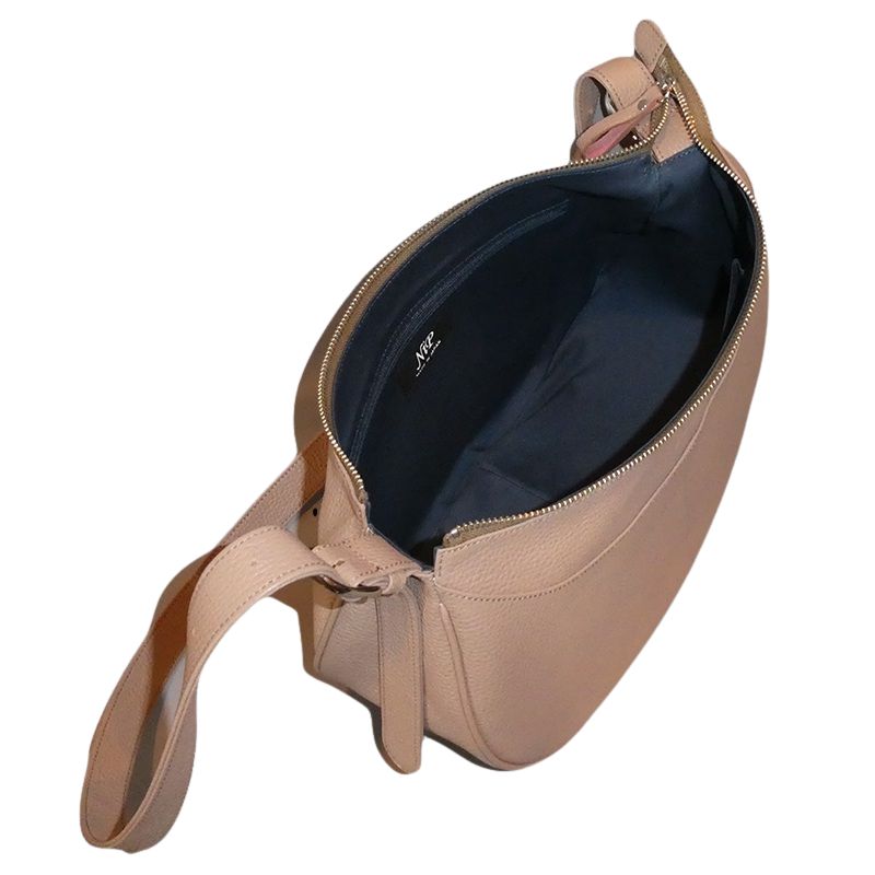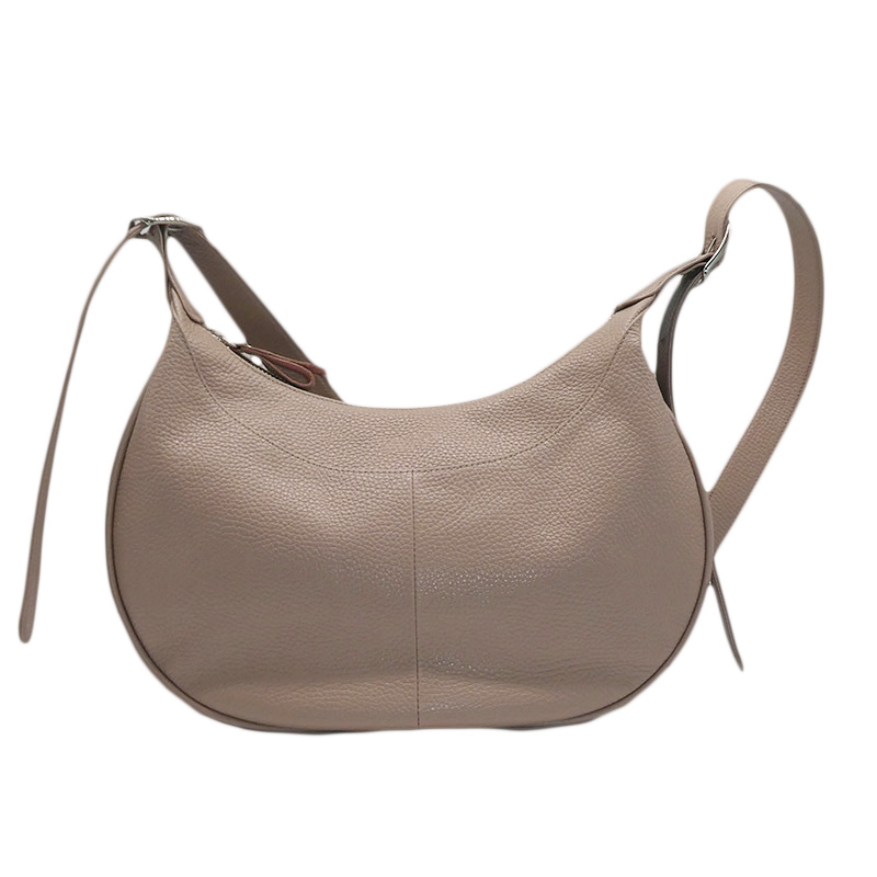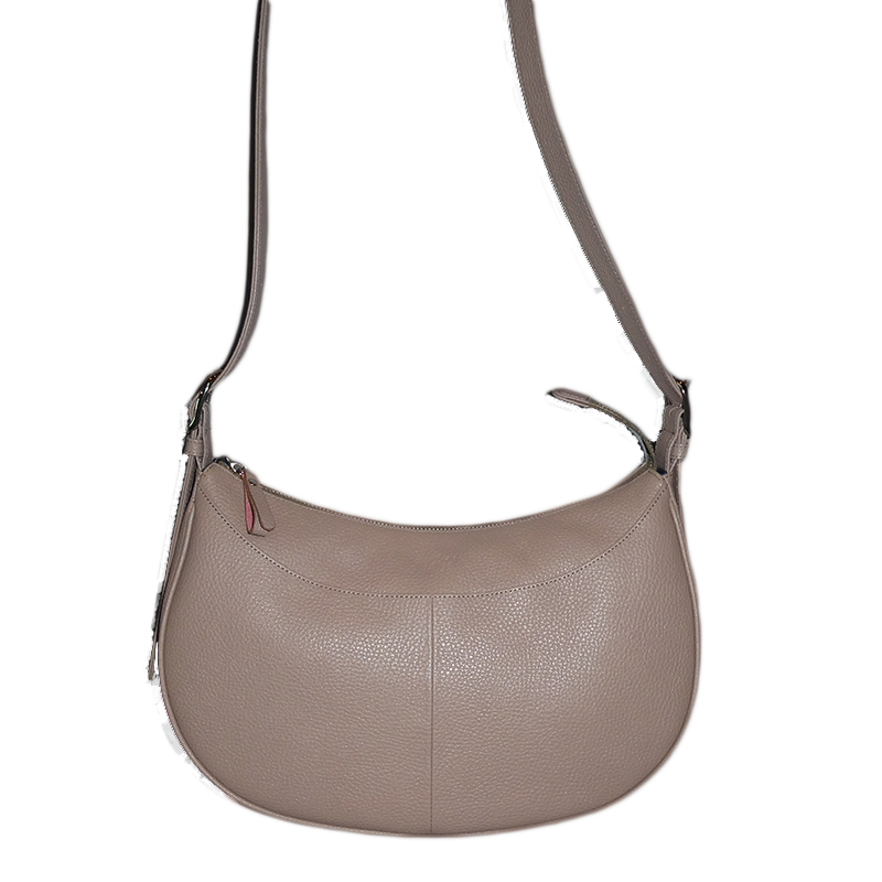美しい弧を描くハーフムーン(三日月型)のフォルムが、身体に優しく寄り添う新作ショルダーバッグです。上質なレザーに施された丁寧なシボ型押し加工が、深みのある高級感と洗練された大人のエレガンスを演出。デザインの美しさだけでなく、日々の使いやすさもしっかりと追求した、デザイン性と機能性を兼ね備えたアイテムです。