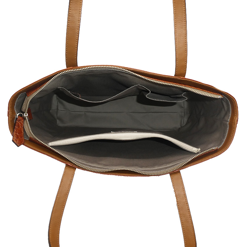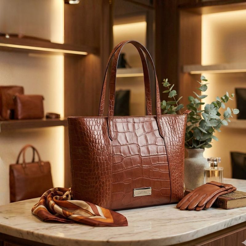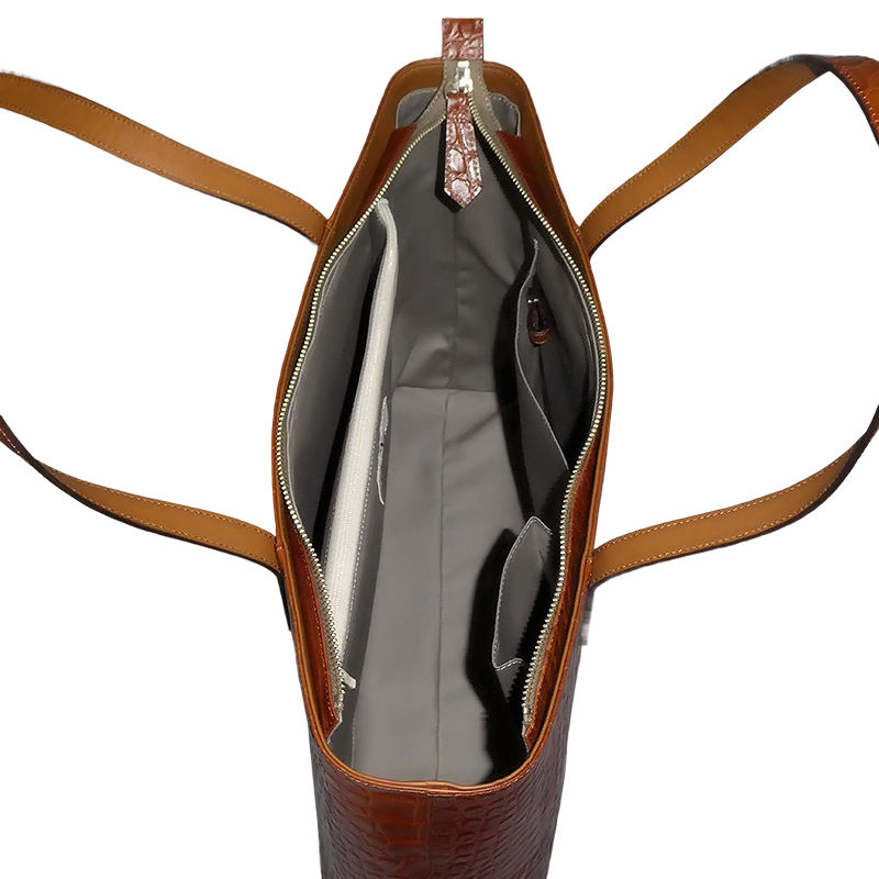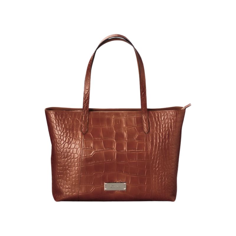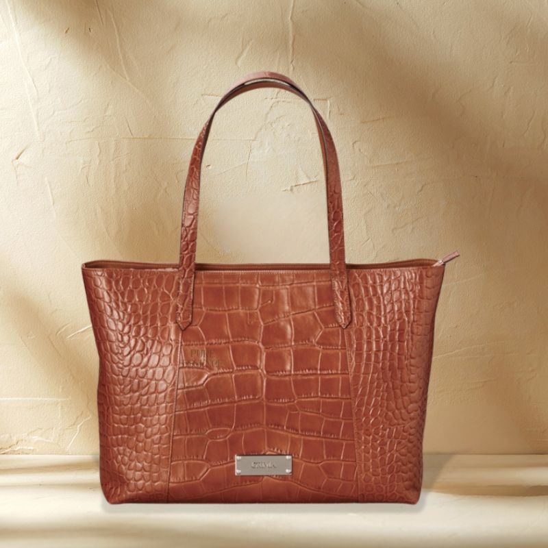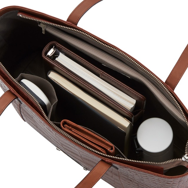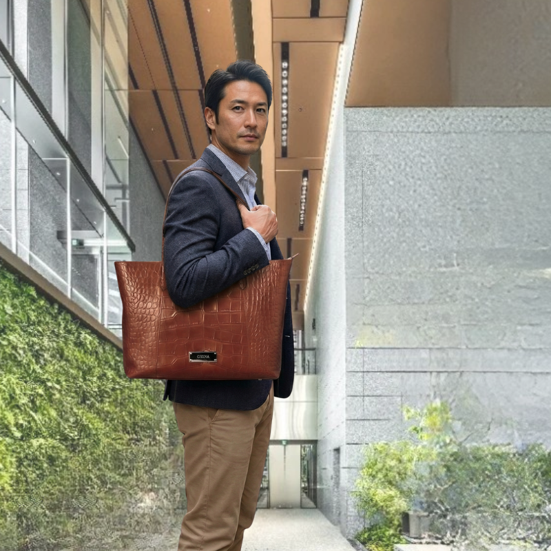 深みのあるブラウンカラーと、リアルなクロコダイルの斑(ふ)模様が美しい、存在感あふれるトートバッグです。上質な素材感と実用性を兼ね備え、ビジネスからプライベートまで、持つ人のスタイルを格上げします。