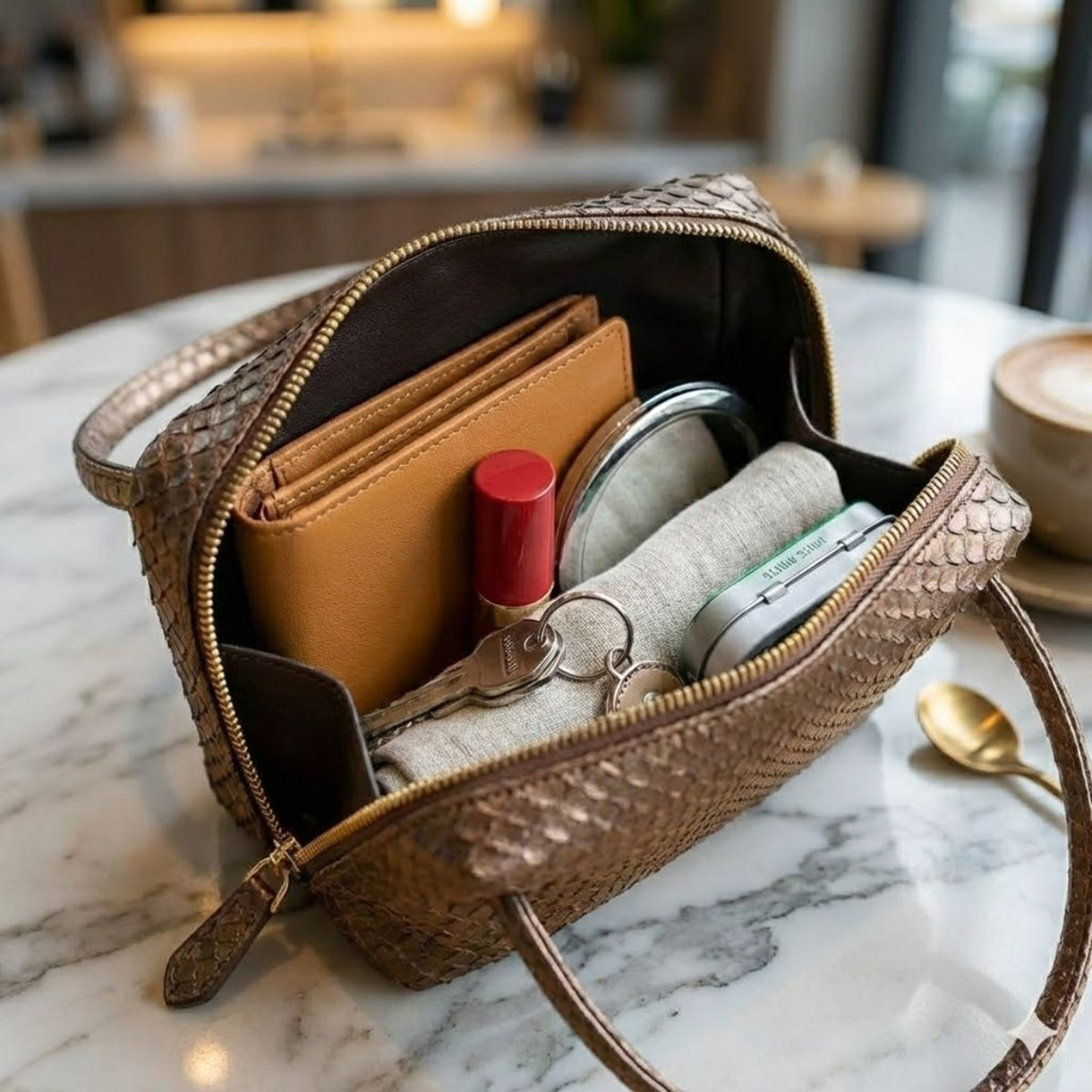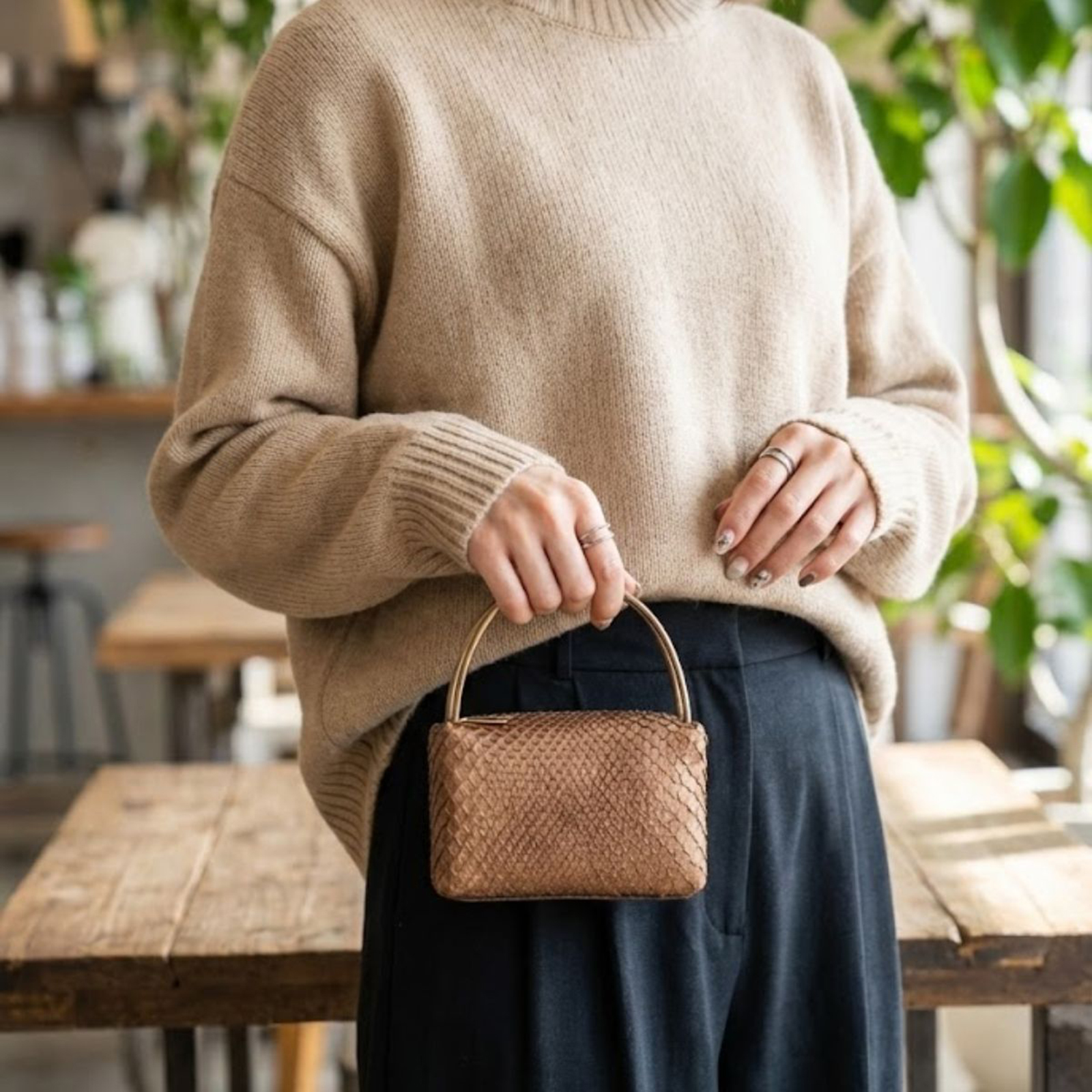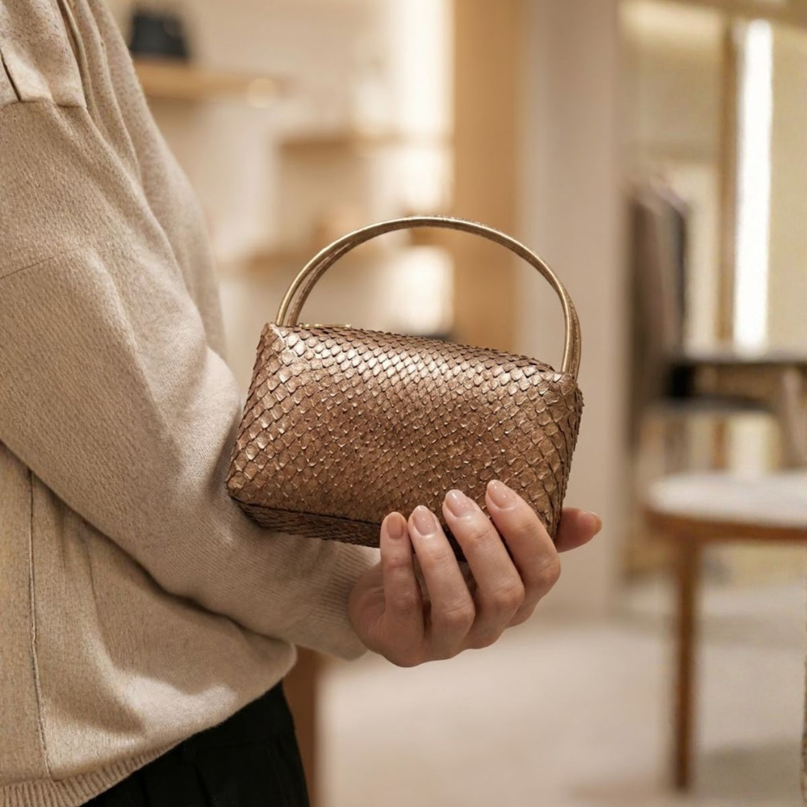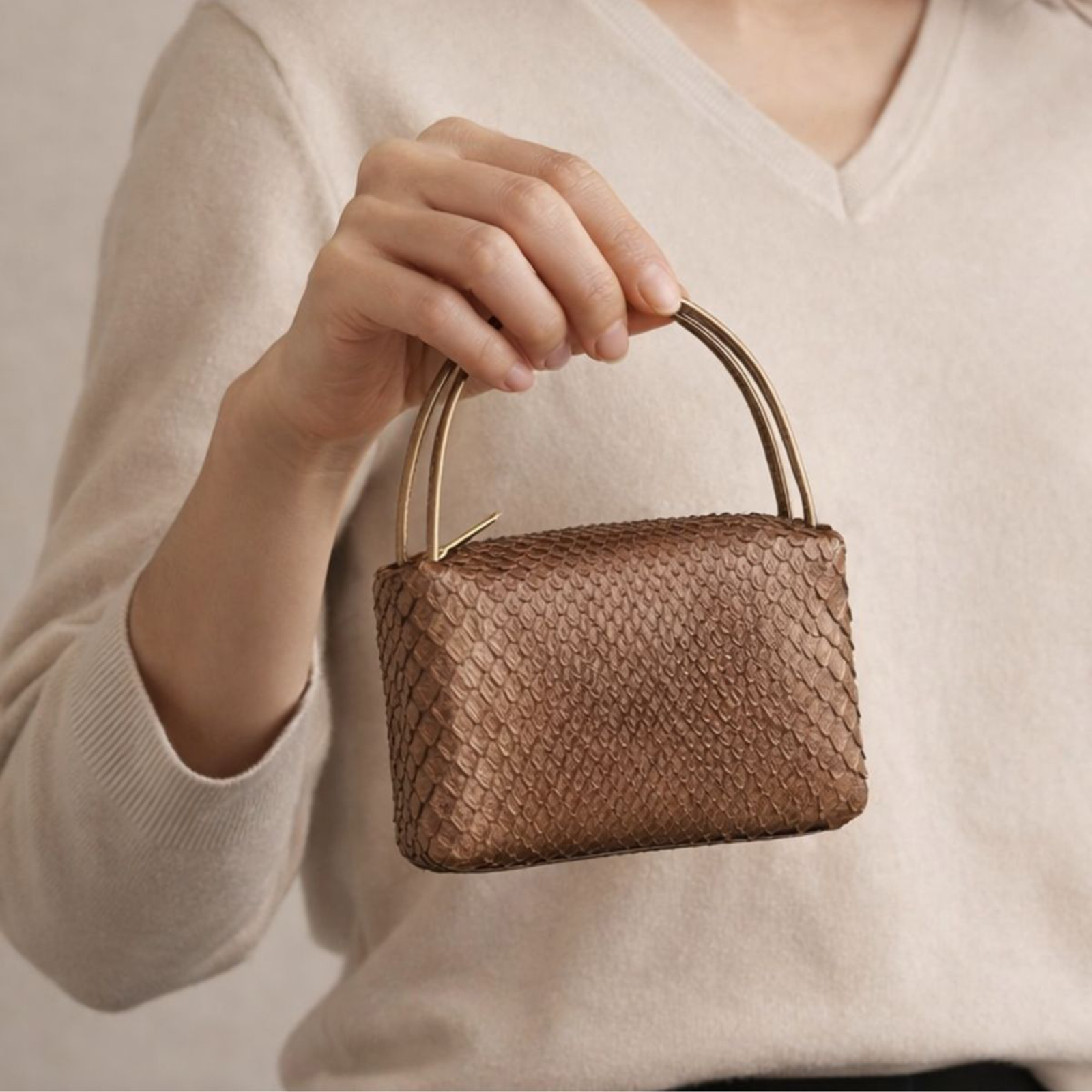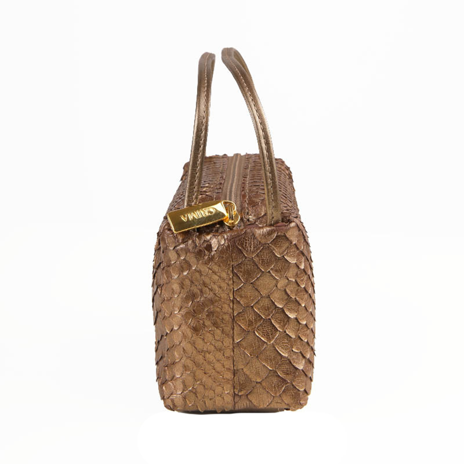 ご紹介するのは、日本の熟練職人が手がけるブランド「GRIMA」より、本物のパイソン(ニシキヘビ)を贅沢に使用したプチ・バッグです。